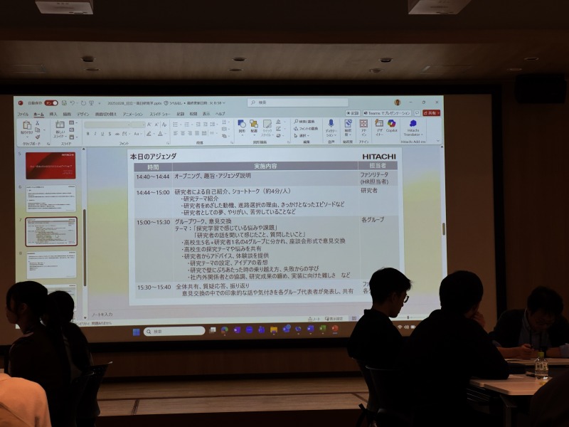 受講した生徒から、「今回は日立製作所について学ぶだけでなく、将来の進路や職業を決定する機会になった。」、「研究するに当たっての条件やパラメータ設定のコツや、研究の芯はどこか定める方がよいということなど、色々聞けて良かった。無理に新しいものを研究するのではなく、既にあるものをより良くするためにも研究するんだと言われ、なるほど と思えた。」といった感想を持ちました。高校や大学では学ぶことのできない貴重な経験ができたようです。