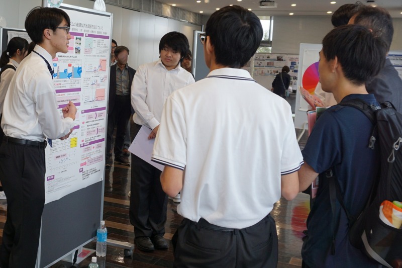 午後は,本校に戻り,「白堊研究」「サイエンスリテラシー」の集大成として,サイエンス科3年次および附属中学3年生がポスター発表を行いました。参加した先生方,生徒と数多くのディスカッションが繰り広げられました。