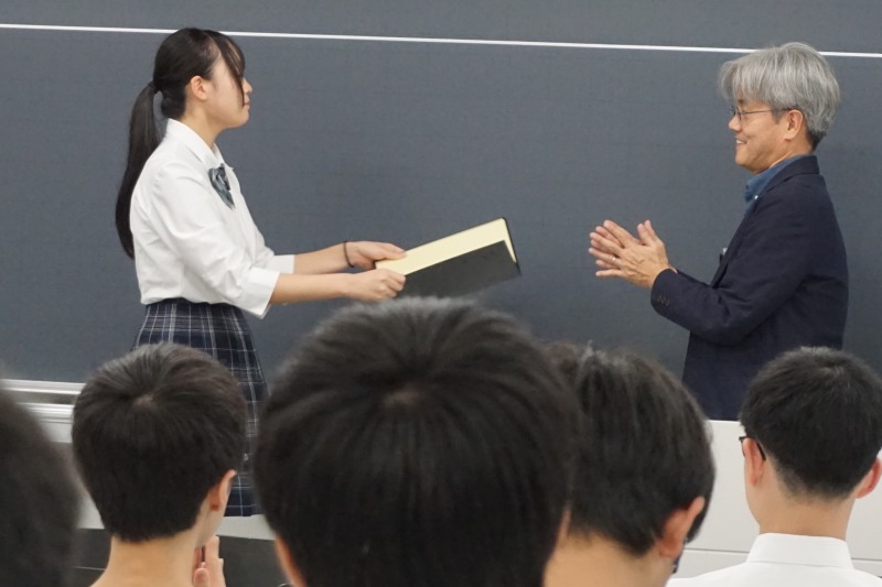 生徒からは「粒子線によるがん治療のメカニズムの説明が聞きたい」という研究内容への質問や,「研究の継続を支えたものは何か」という心情への質問など多くの質問が出され,興味関心が喚起された講演となりました。