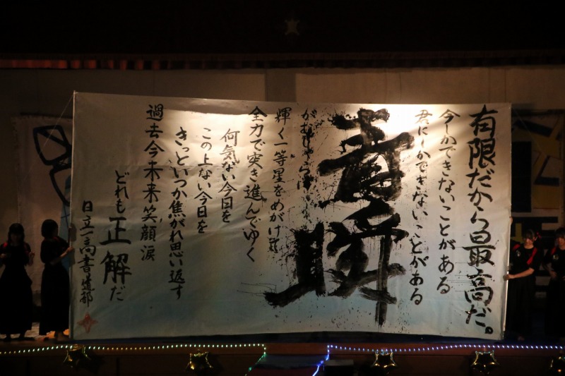 今回のパフォーマンスは書道部として最後の作品でした。パフォーマンスを作っていくにあたって、たくさん時間をかけて、たくさん部員で話し合って、よりよいものを作ってきました。自分でも最高の作品だと思えるパフォーマンスで、多くの人の心を動かすことができ、最高の経験となりました。『あなたにとって青春とは?』私にとって青春は書道部でした。本当にありがとうございました。